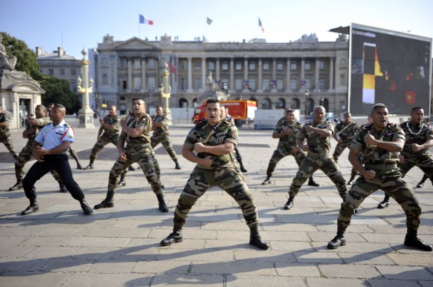In onore del Fabio in foto qui in alto i componenti di una squadra di rugby di soldati francesi (Le XV du Pacifique) provenienti dalle isole del Pacifico che fanno la haka in Place della Concorde per l’anniversario della presa delle Bastiglia. KA MA TE KA MA TE KA-ORA KA ORA …….